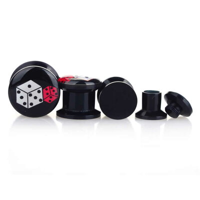 ダブルフレアの黒のアクリルプラグにサイコロをデザインしたボディピアス。