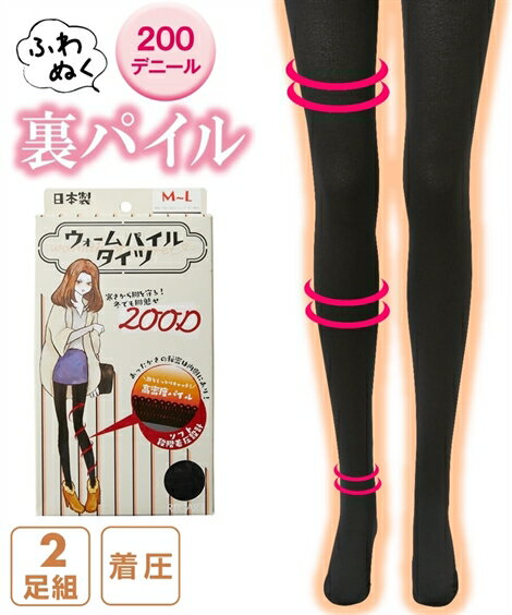 【期間限定 クーポン&ポイント10倍】 ストッキング・タイツ (M〜L-L〜LL) 着圧 裏パイル 200デニール タイツ 2足組 ニッセン nissen 黒 セット ひきしめ